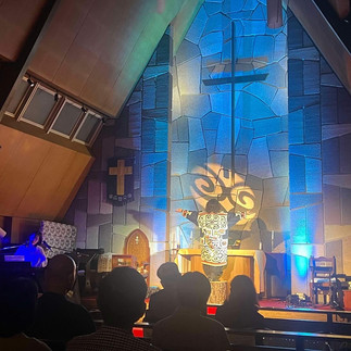 ちょうど夕陽でステンドグラスからの光が差し込み